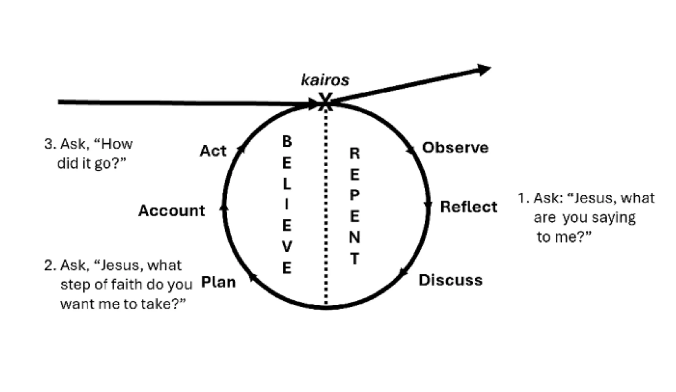I vividly remember when this process first became clear to me. I was in northern England learning about all this at a conference hosted by St. Thomas Church in Sheffield. When the session ended, I turned to my friend Greg and blurted out, “This is the whole story! If you get this, you get everything else!” It was hitting me that when we learn to accurately discern what Jesus is saying to us and, with the help of our friends, we respond by exercising the faith his word is producing, then everything else that matters will flow from that! You could say it was a major kairos moment for me.